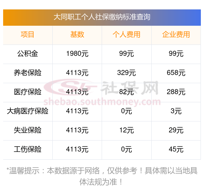 大同社保多少钱一个月?下面和新社君一起来看看大同最低标准社保费用明细参考,新社通app-社保缴费查询工具提供的最新数据如下:
