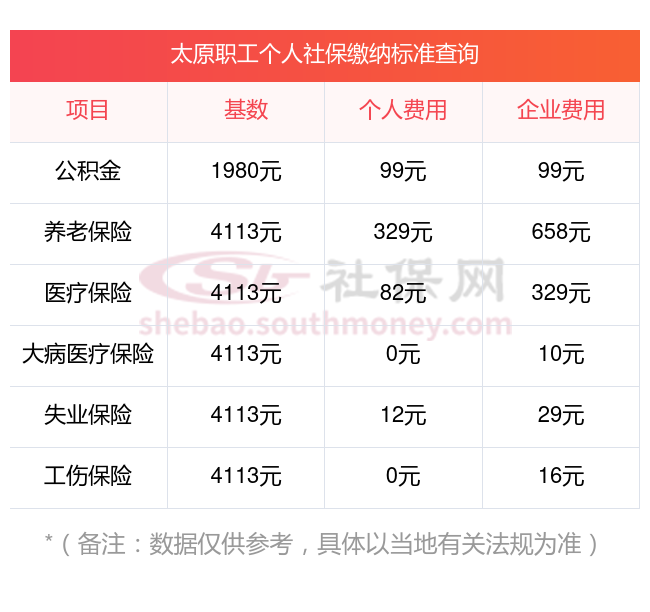 太原2025年养老保险缴费标准是多少?下表是2025年太原社保费用明细参考,新社通app-社保缴费查询工具提供的最新数据如下: