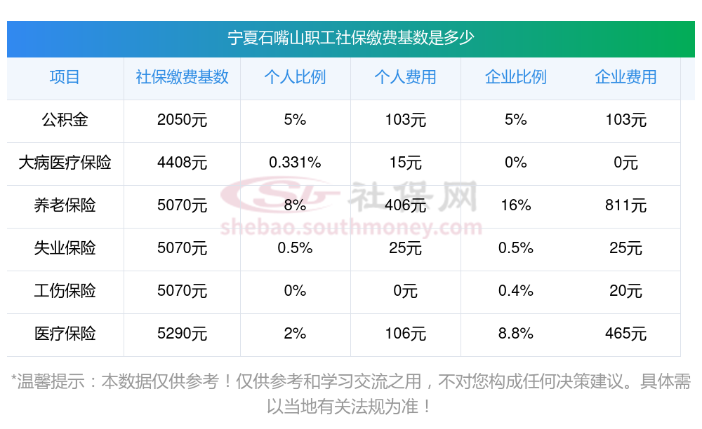 2025年宁夏石嘴山社保缴费多少钱?下表是2023-2024年宁夏石嘴山社保费用明细参考,新社通app-社保缴费查询工具提供的最新数据如下: