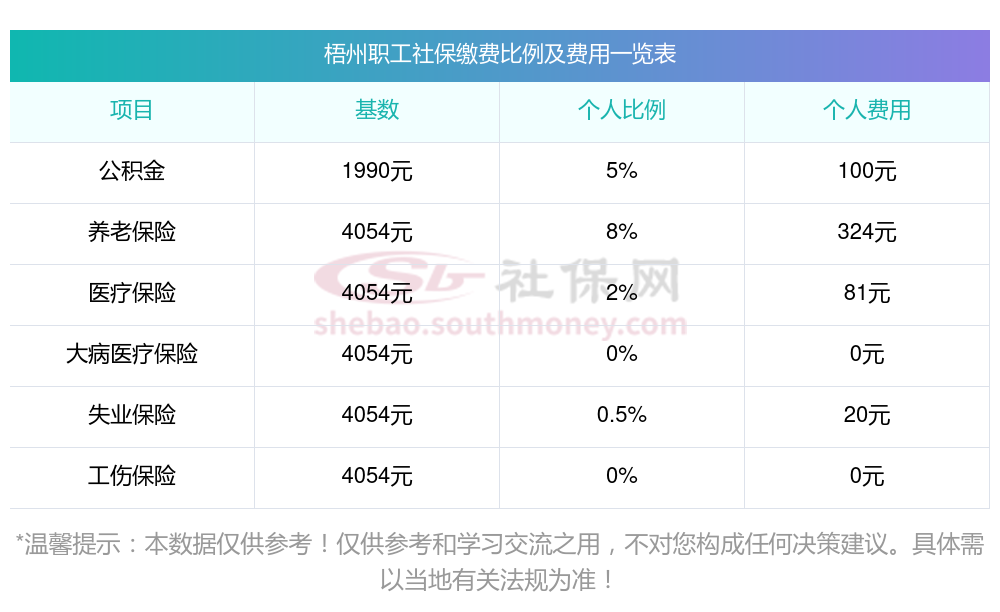 2025年梧州社保缴费多少钱?下表是2023-2024年梧州社保费用明细参考,新社通app-社保缴费查询工具提供的最新数据如下: