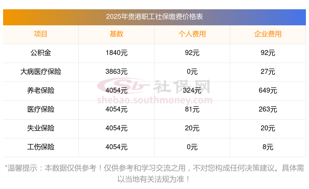 贵港2025年养老保险缴费标准是多少?下表是2025年贵港社保费用明细参考,新社通app-社保缴费查询工具提供的最新数据如下: