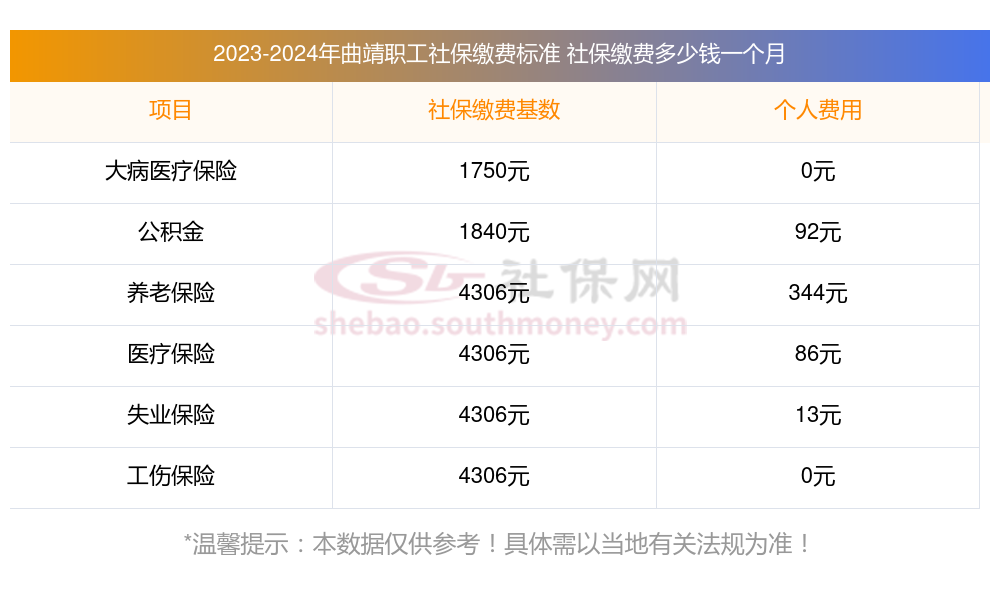 2025年曲靖5险缴费标准,2025年曲靖社保缴费多少钱?下表是2025年曲靖社保费用明细参考,新社通app-社保缴费查询工具提供的最新数据如下: