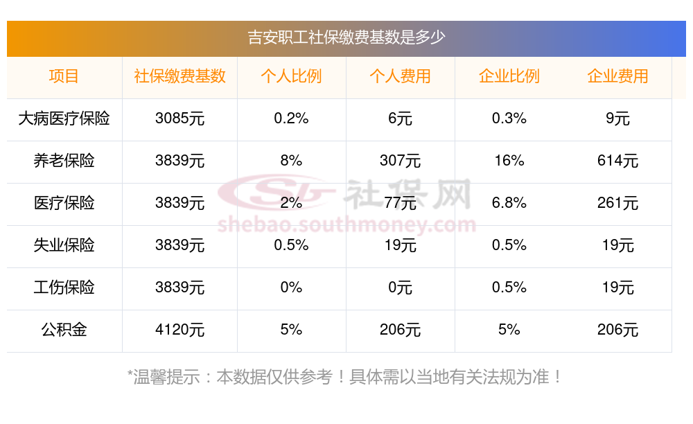 2025年吉安社保缴费最低基数及个人和单位具体是多少钱?下表是2025年吉安社保费用明细参考,新社通app-社保缴费查询工具提供的最新数据如下: