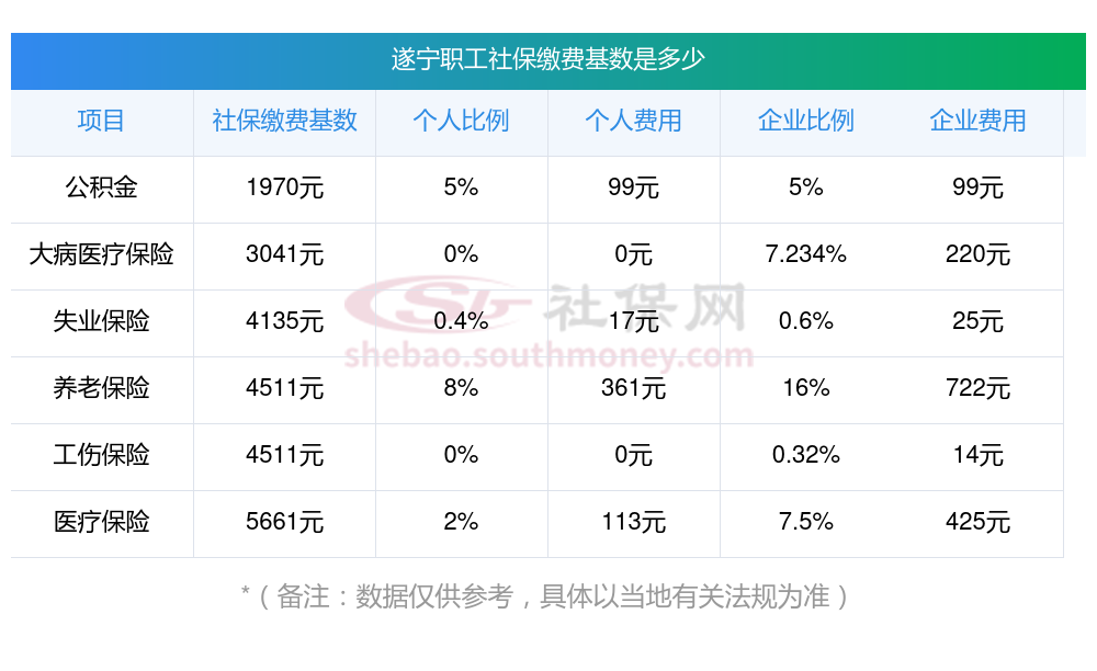 2025年遂宁社保缴费最低基数及个人和单位具体是多少钱?下表是2025年遂宁社保费用明细参考,新社通app-社保缴费查询工具提供的最新数据如下:
