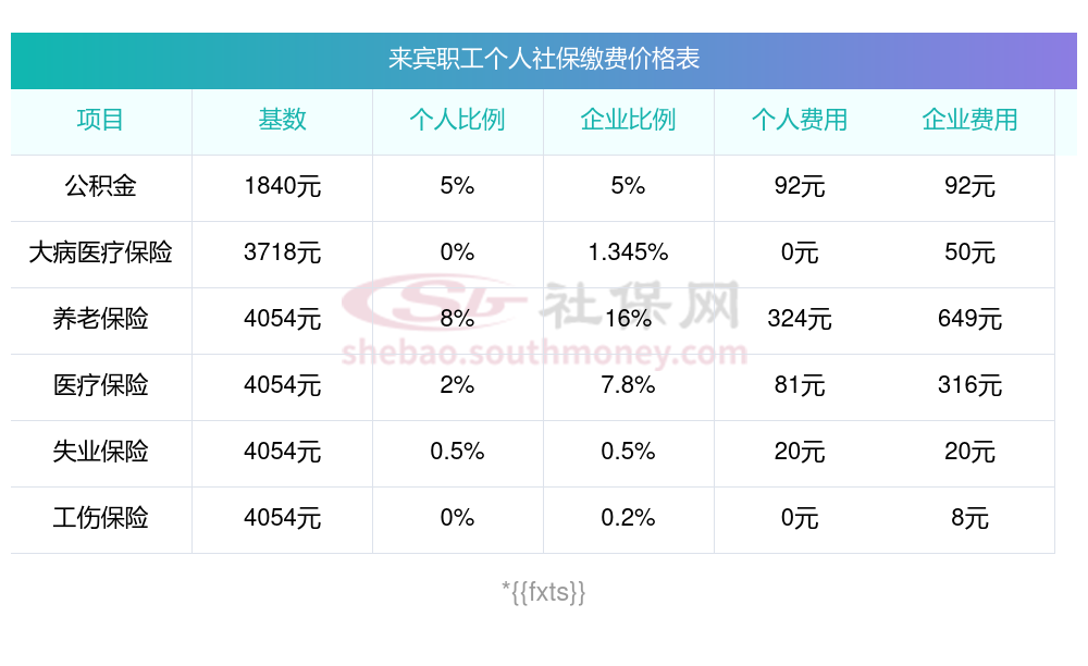 2025年来宾社保缴费多少钱?下表是2023-2024年来宾社保费用明细参考,新社通app-社保缴费查询工具提供的最新数据如下:
