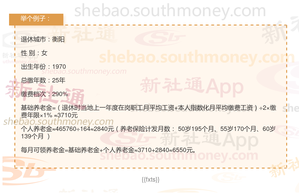 退休城市:衡阳,性别:女,出生年份:1970,总缴年数25年,缴费档次:290%,新社通app养老金计算器所得: