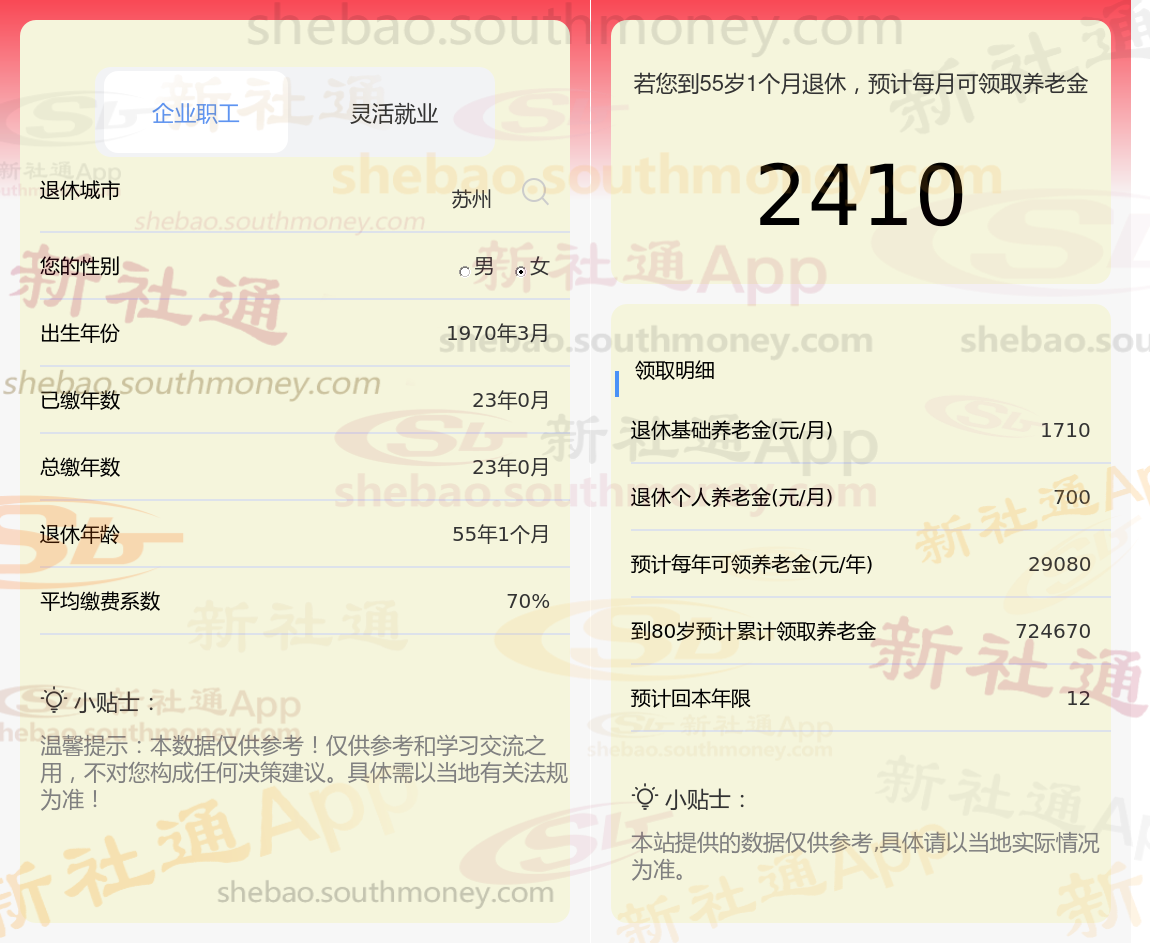 个人档案:女性,1970年出生,江苏苏州退休职工,社保缴费23载,档次70%。