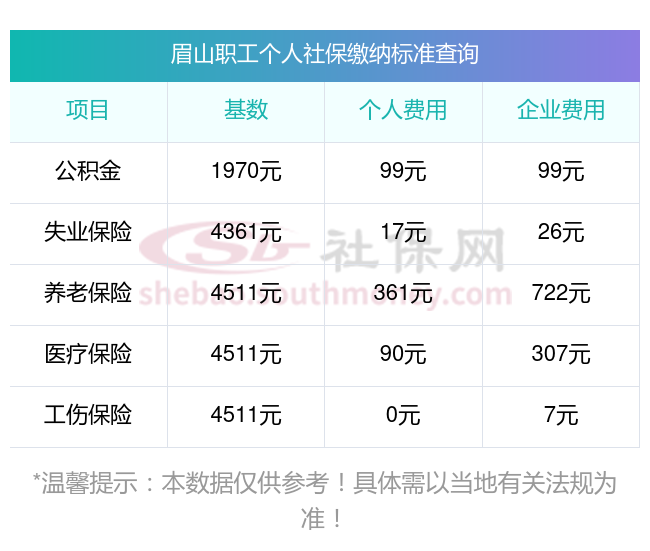 社保缴纳比例一览,社保公司和个人各交多少?下表是2023-2024年眉山社保费用明细参考,新社通app-社保缴费查询工具提供的最新数据如下: