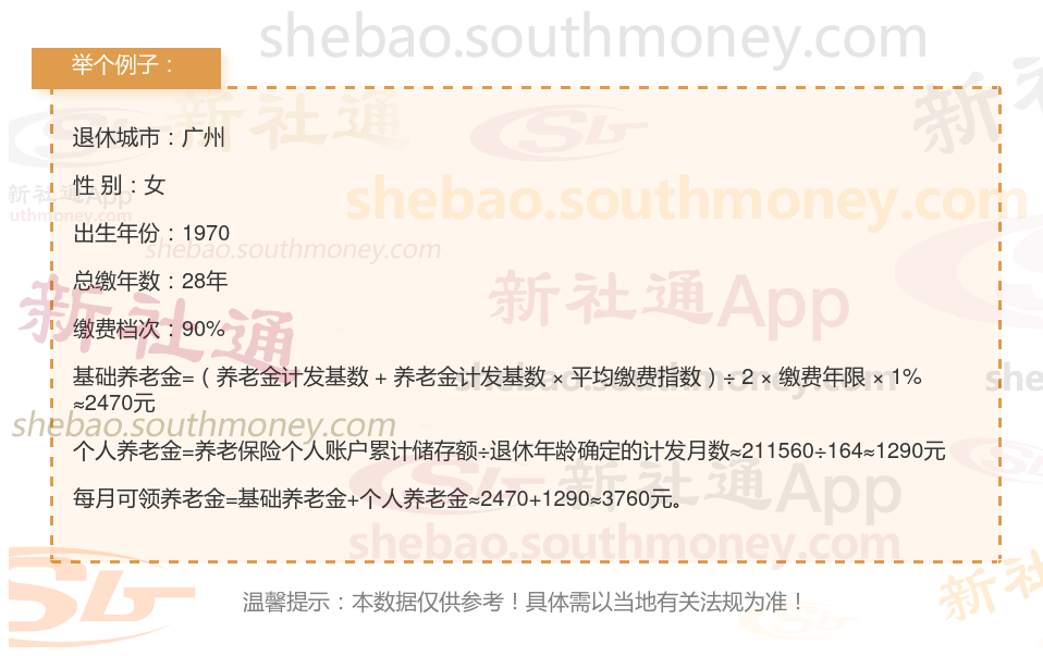 杨某,广州人,1970年出生,是一名拥有28载社保缴费年限的退休女性,缴费档次稳定在90%。岁月流转,她终于迎来了自己的退休时光。借助新社通app养老金在线计算器计算所得: