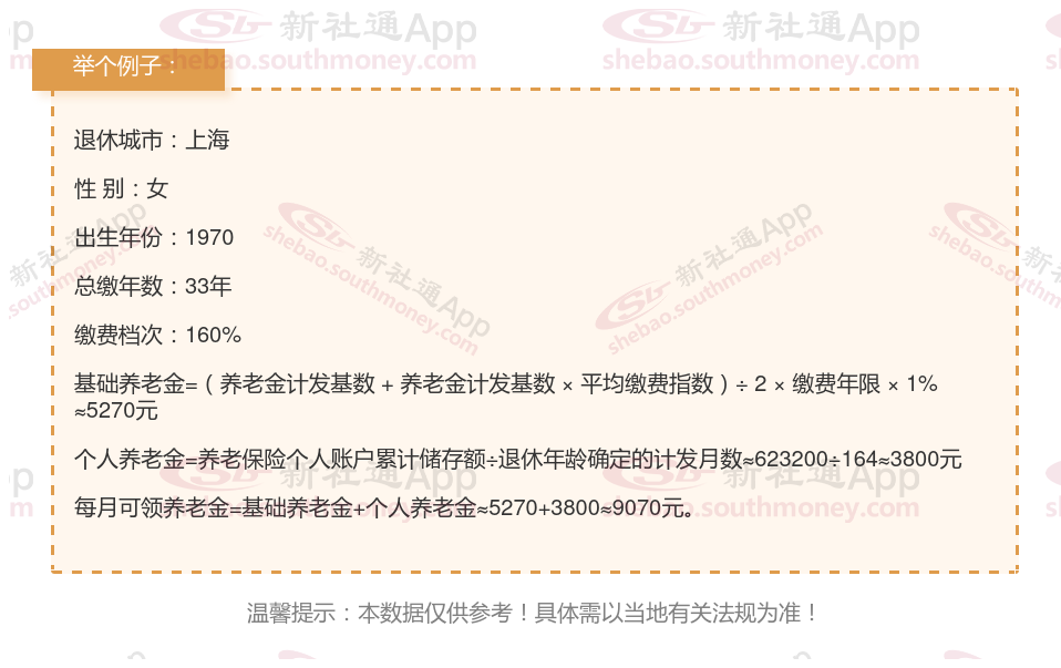 夏某,上海人,1970年出生,是一名拥有33载社保缴费年限的退休女性,缴费档次稳定在160%。岁月流转,她终于迎来了自己的退休时光。借助新社通app养老金在线计算器计算所得: