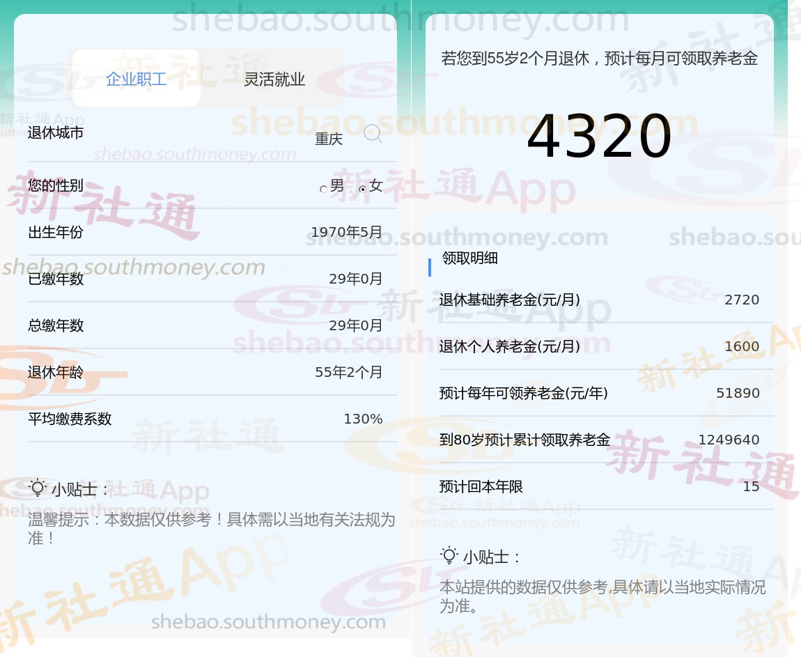 夏某,重庆人,1970年出生,是一名拥有29载社保缴费年限的退休女性,缴费档次稳定在130%。岁月流转,她终于迎来了自己的退休时光。借助新社通app养老金在线计算器计算所得: