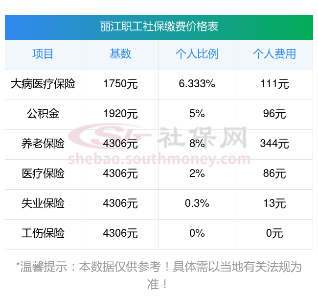 丽江2025年养老保险缴费标准是多少?下表是2025年丽江社保费用明细参考,新社通app-社保缴费查询工具提供的最新数据如下: