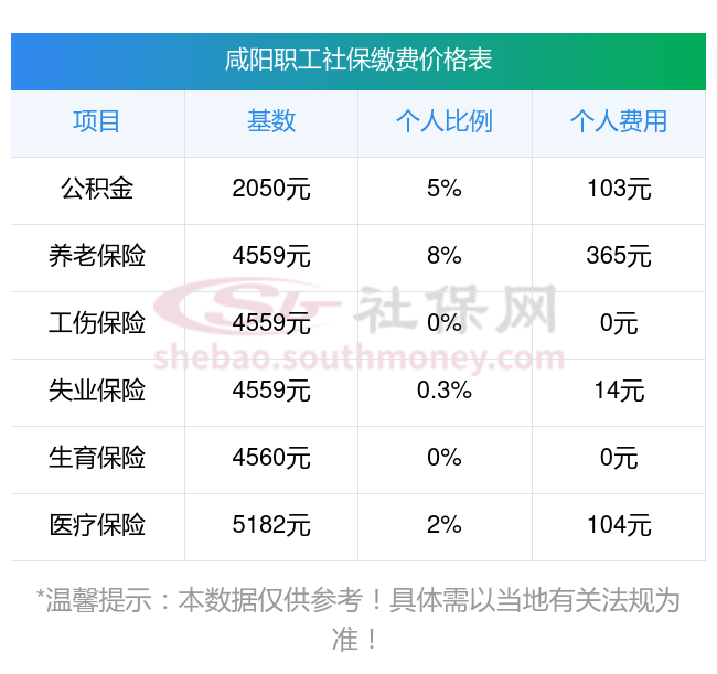 2025年咸阳5险缴费标准,2025年咸阳社保缴费多少钱?下表是2025年咸阳社保费用明细参考,新社通app-社保缴费查询工具提供的最新数据如下: