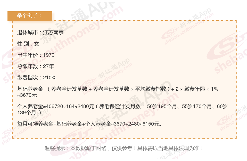 王某,1970年出生于江苏南京,是一位拥有27年社保缴费记录的退休职工,缴费档次为210%。辛勤工作多年后,她迎来了退休生活。通过新社通app养老金计算器计算所得,王某得知自己每月可以领取到基础养老金约3670元,加上个人养老金约2480元,总计6150元。虽然金额不算多,但对于王某来说,这是一份稳定的收入来源,为她的退休生活增添了一份安心与保证。