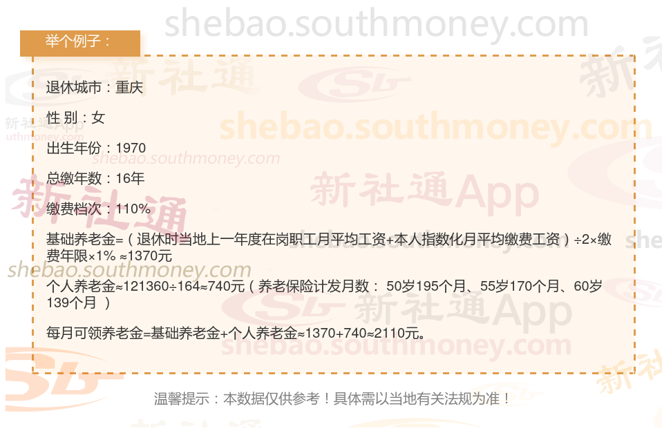 社保按110%档次缴费的张某,重庆城市退休,出生于1970年,工龄16年,女性。岁月流转,她终于迎来了自己的退休年龄。根据新社通app养老金在线计算器计算所得: