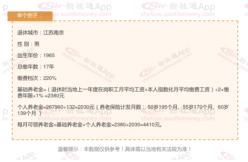 个人基础信息:男性,1965年出生,江苏南京退休人士,拥有17年的缴费年限,缴费档次为220%。