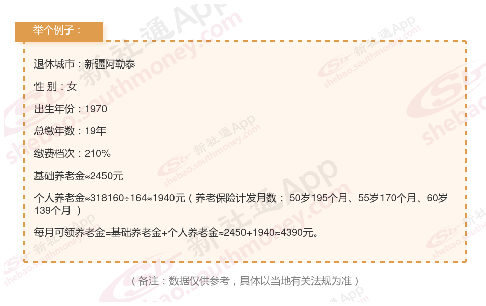 个人档案:女性,1970年出生,新疆阿勒泰退休职工,社保缴费19载,档次210%。
