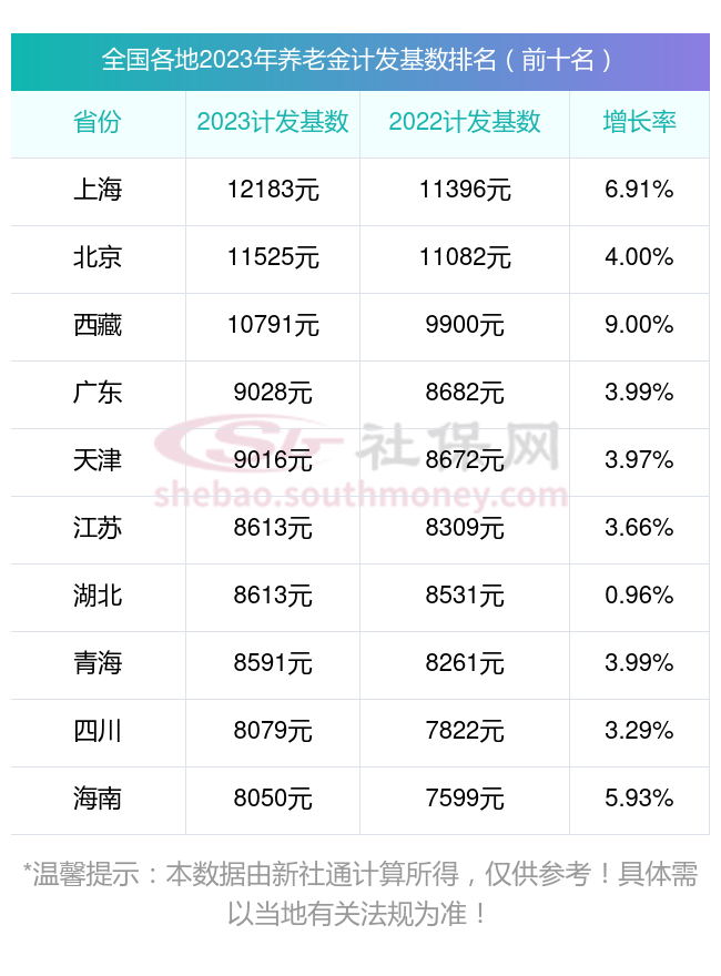 下面来看看全国各地2023年养老金计发基数一览表(前十名)