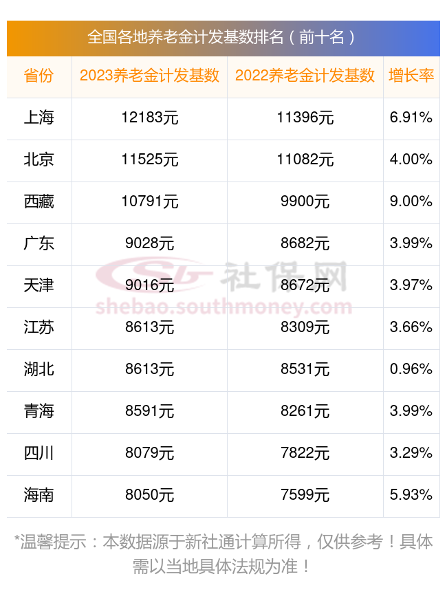 上海位列第一位,养老金计发基数达到12183.00元,增长率为6.91%;