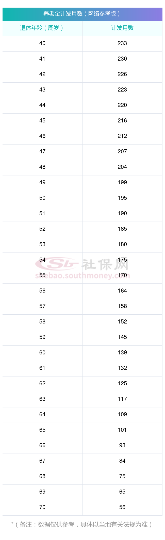 目前,我国对于不同年龄段的退休职工设定了不同的养老金计发月数。一般来说,退休年龄越早,计发月数越大,退休时计发的个人账户养老金相对越低;退休年龄越晚,计发月数越小,退休时计发的个人账户养老金水平相对越高。例如,60岁退休的职工,其个人账户养老金的计发月数为139个月;55岁退休的职工,计发月数为170个月;而50岁退休的职工,计发月数则为195个月。