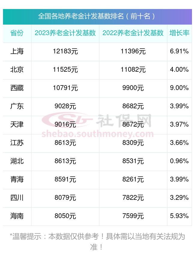 一、2023-2024年全国各地养老金计发基数排名前十