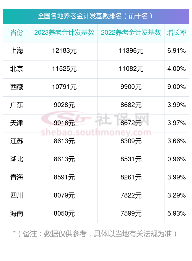北京排名第二,养老金计发基数为11525.00元,增长率为4.00%;