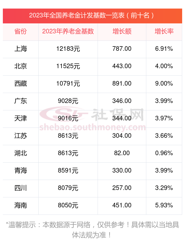 随着四川遂宁公布计发基数,大家都知道2023年养老金计发基数目前在全国排名前几位的情况如何呢?在这里简单分享一下: