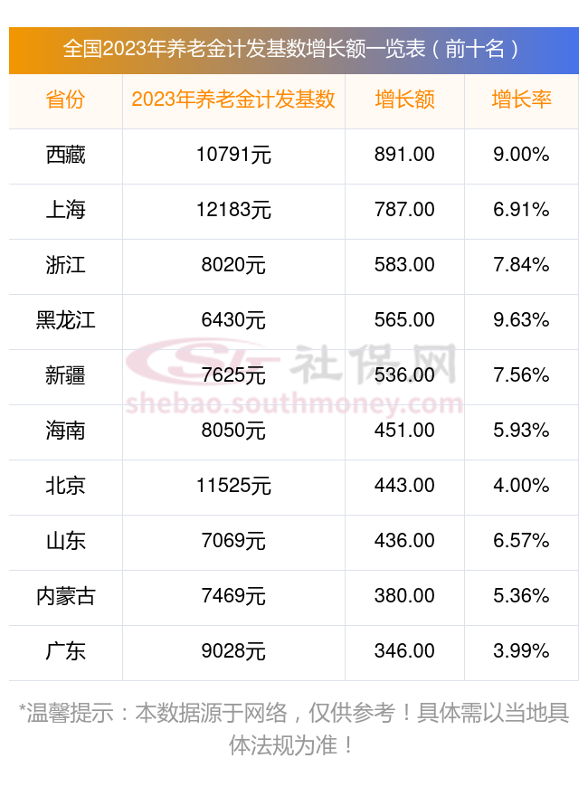 2023年最新养老金计发基数增长额排行榜前几位的情况如何呢?