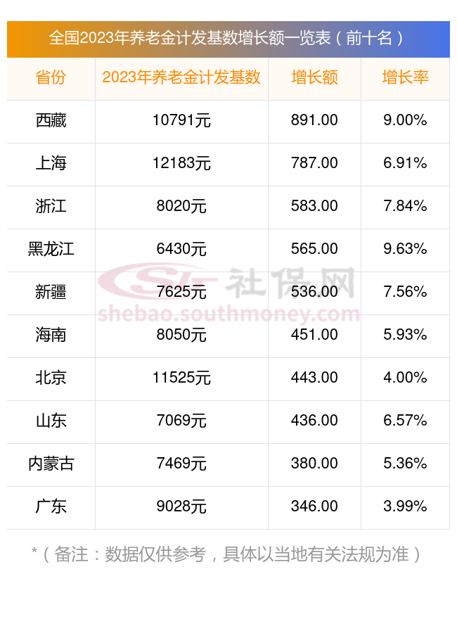 很多朋友好奇哪些省份的养老金计发基数涨幅较大?社保网小编整理了2023年养老金计发基数增长额排行榜前十名,分享如下