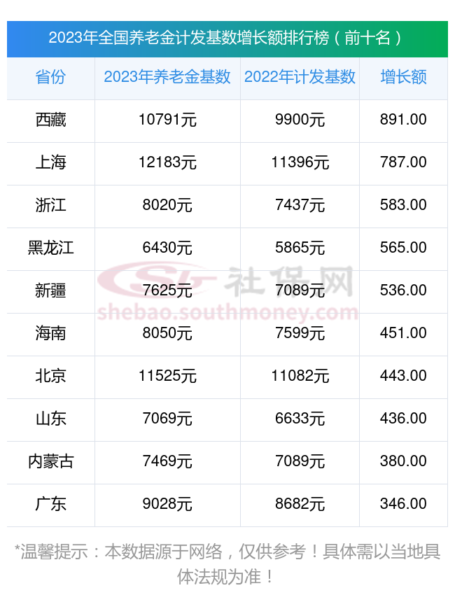 2023年最新养老金计发基数增长额排行榜前几位的情况如何呢?