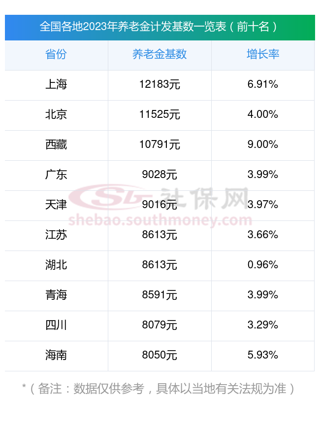 据新社通app显示,2023年上海位列第一位,养老金计发基数达到12183.00元,增长率为6.91%;北京排名第二,养老金计发基数为11525.00元,增长率为4.00%;西藏排名第三,养老金计发基数11010.00元,增长率为1.99%。排名前10的还有:广东、天津、湖北、江苏、青海、四川、海南。