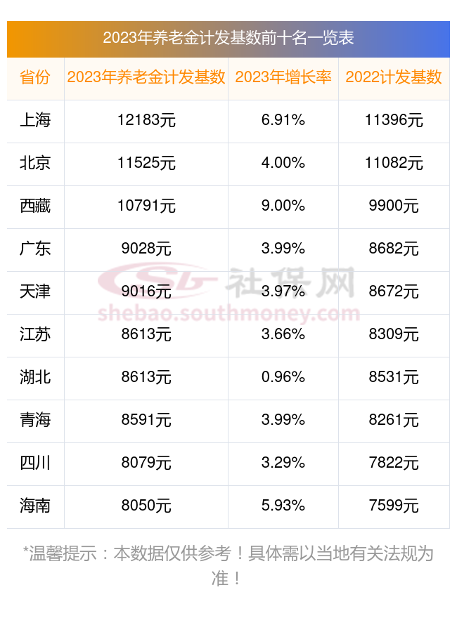 截至目前,2023年全国养老金计发基数排名前十名情况如下