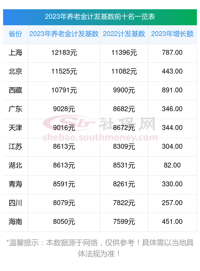 据新社通app显示,2023年上海位列第一位,养老金计发基数达到12183.00元,增长率为6.91%;北京排名第二,养老金计发基数为11525.00元,增长率为4.00%;西藏排名第三,养老金计发基数11010.00元,增长率为1.99%。排名前10的还有:广东、天津、湖北、江苏、青海、四川、海南。