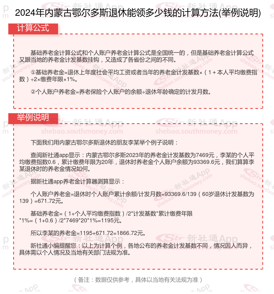 内蒙古鄂尔多斯退休工资养老金计算方法及公式2024年最新(举例说明)