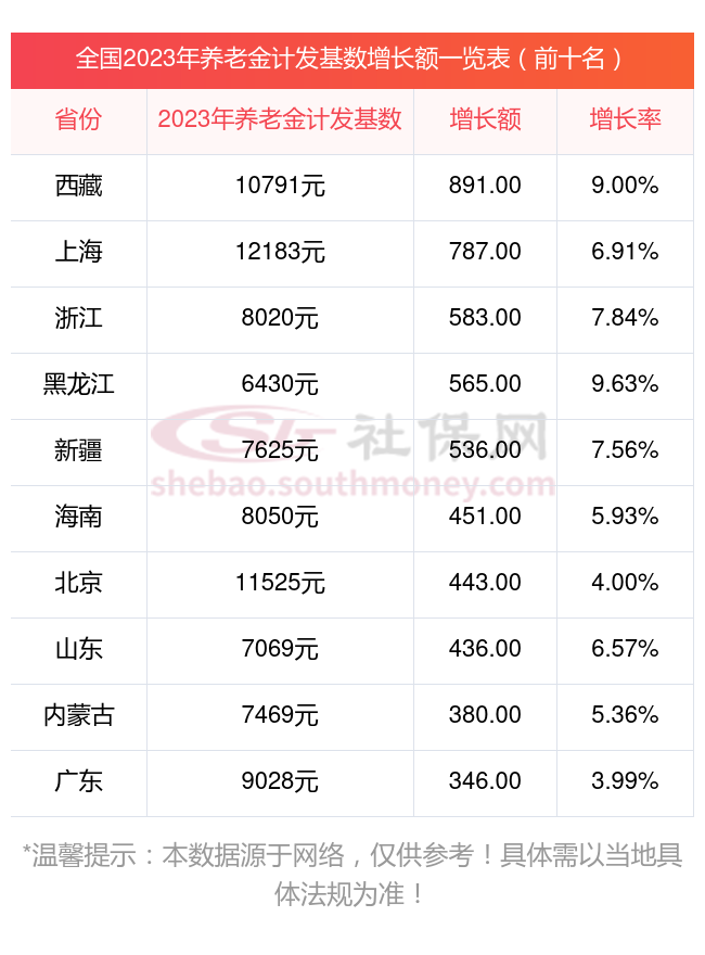 2023年最新养老金计发基数增长额排行榜前几位的情况如何呢?