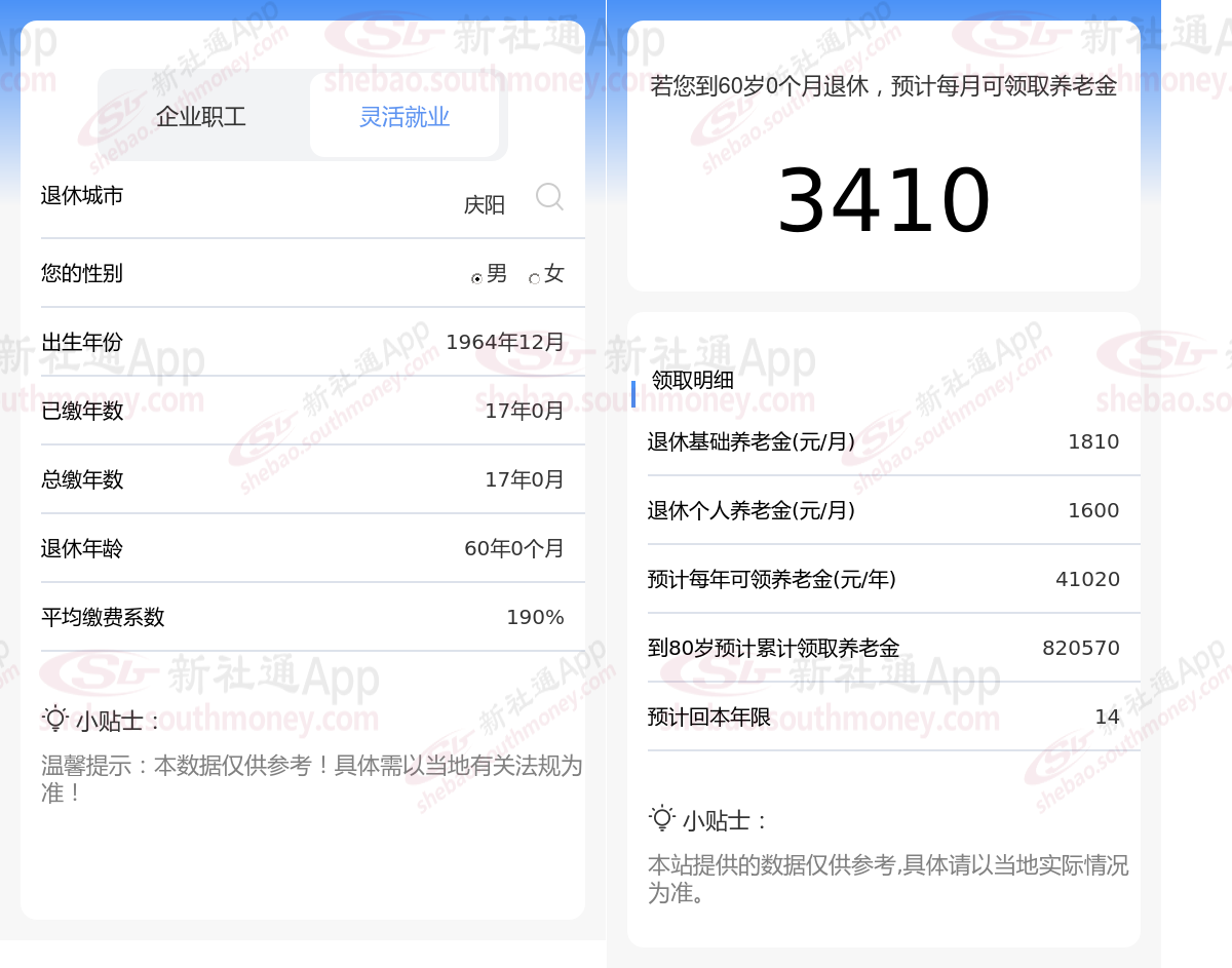 ?基础养老金?:以当地上年度在岗职工月平均工资和本人指数化月平均缴费工资的平均值为基数,缴费每满1年发给1%。计算公式为:基础养老金 = (参保人员退休时全区上年度城镇单位在岗职工月平均工资 + 本人指数化月平均缴费工资)/ 2 × 缴费年限 × 1%。