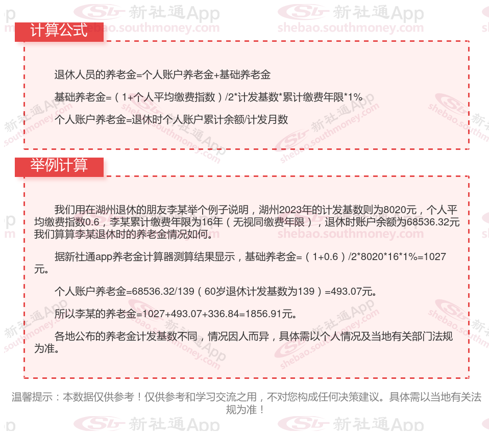 1、基础养老金计算公式=(养老金计发基数+养老金计发基数×平均缴费指数)÷2×缴费年限×1%。