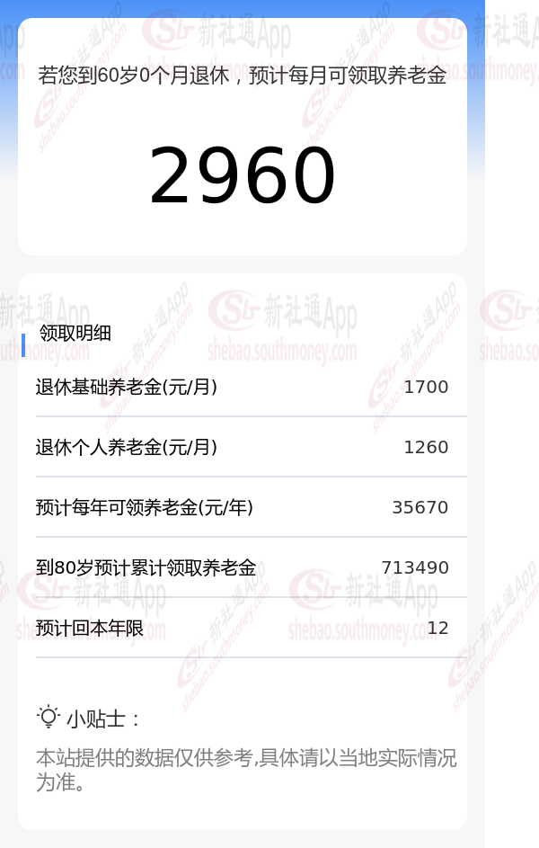每月总共能领多少:把上面两个数加在一起,就是每个月你能领到的养老金总数啦,大概是2960元(即1700元基础养老金+1260元个人养老金)。