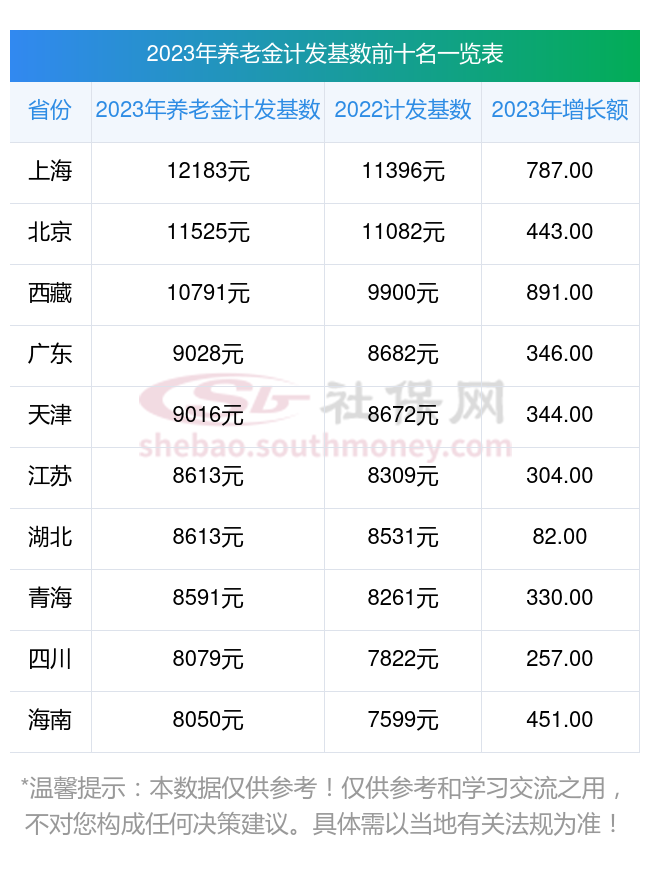 截至目前,2023年全国养老金计发基数排名前十名情况如下