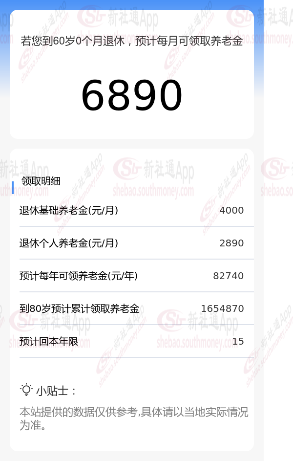 每月养老金总额 = 4000元 + 2890元 = 6890元。
