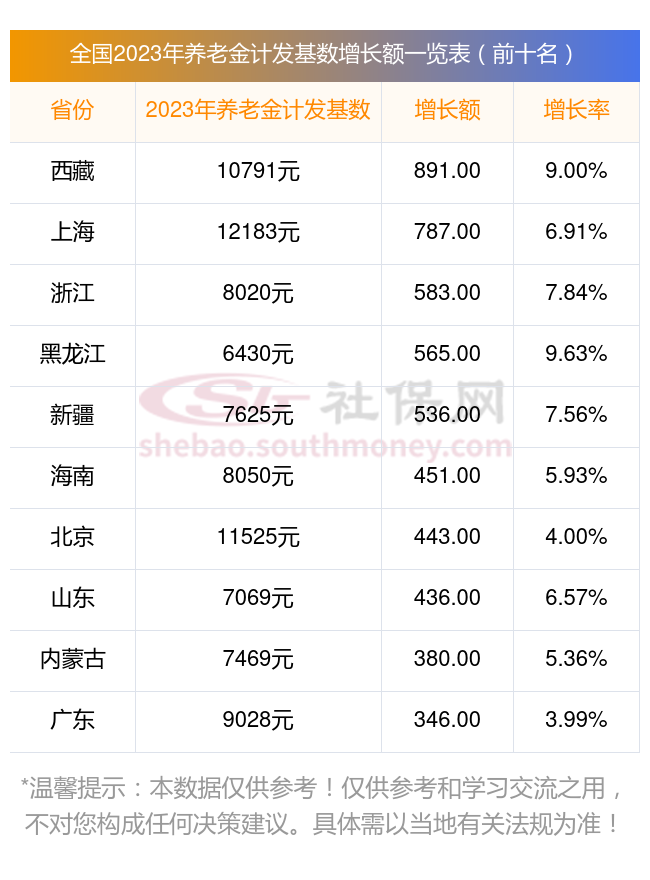 2023年最新养老金计发基数增长额排行榜前几位的情况如何呢?