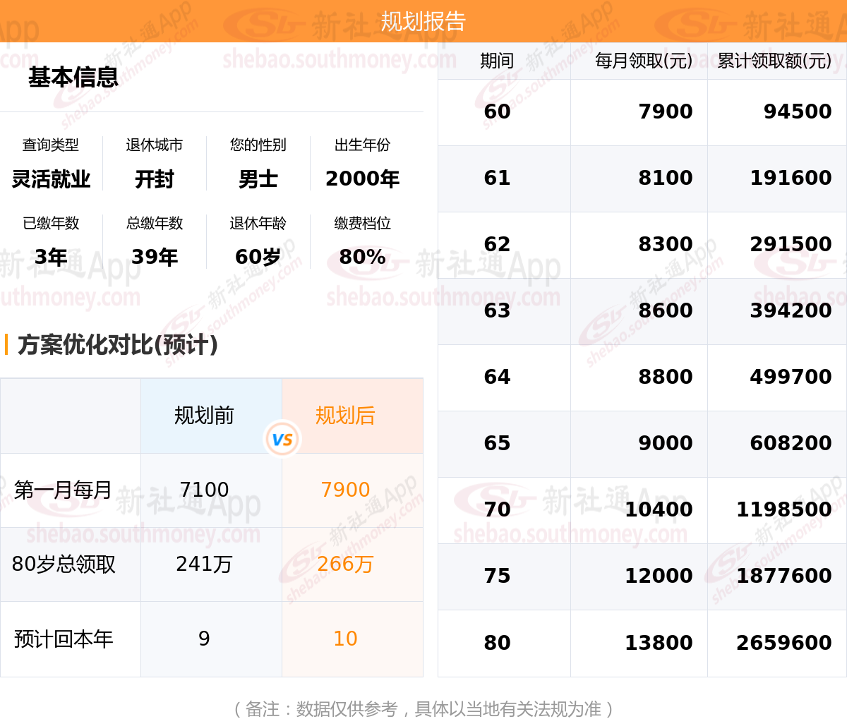 规划前:参保城市:河南开封,性别:男士,出生年月:2000,已缴年限:3年,总缴年数:39年,退休年龄:60岁,缴费档位:80%。