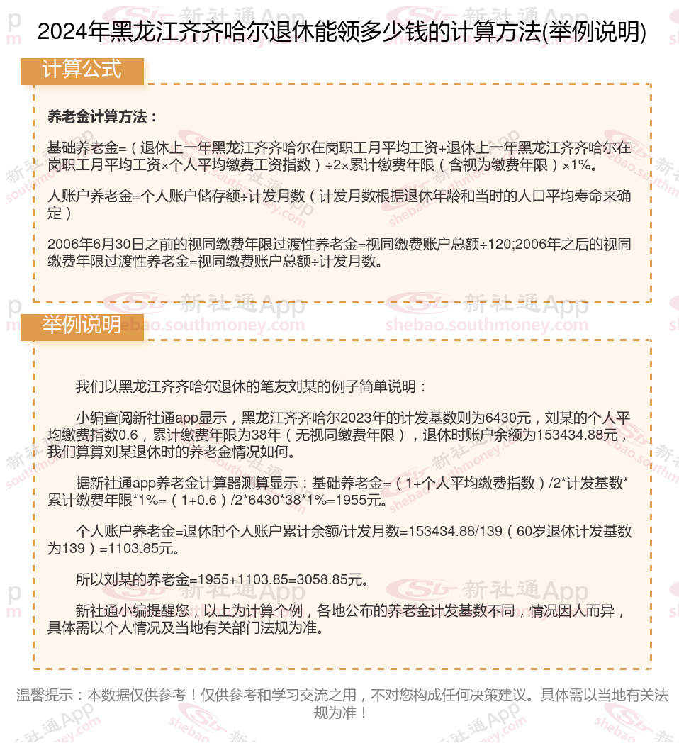 黑龙江齐齐哈尔退休工资养老金计算方法及公式2024年最新(举例说明)