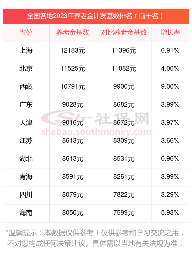 下面已经公布2023年养老金计发基数的前10省份的具体情况