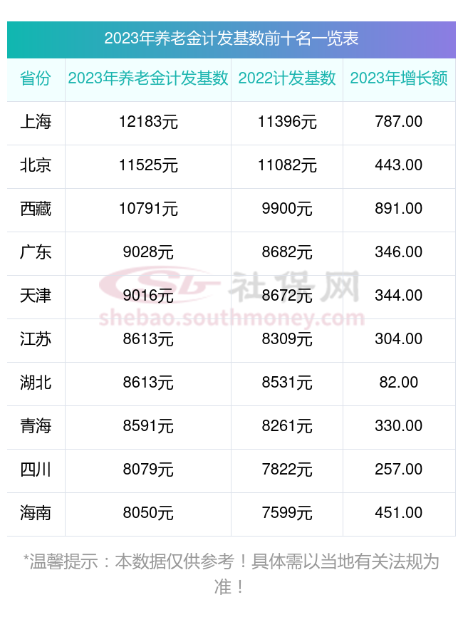 一、2023-2024年全国各地养老金计发基数排名前十