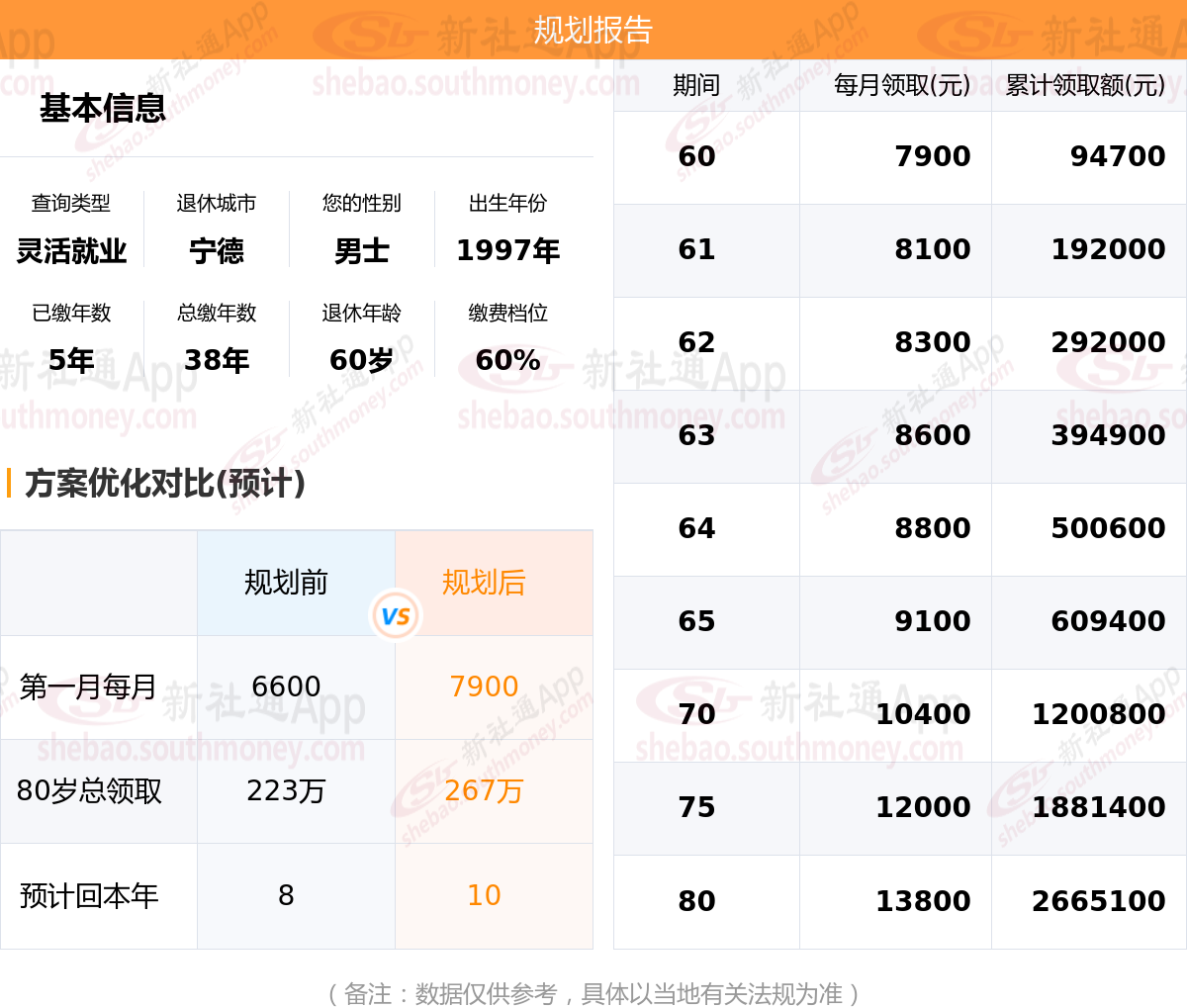 规划前:参保城市:福建宁德,性别:男士,出生年月:1997,已缴年限:5年,总缴年数:38年,退休年龄:60岁,缴费档位:60%。