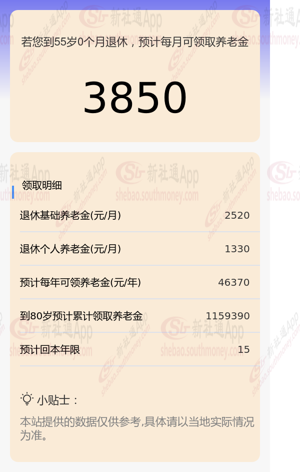 这是一位1969年出生的女性退休职工的个人档案,她来自临沧,已缴纳社保30年,且缴费档次为110%。通过新社通app养老金计算器得出: