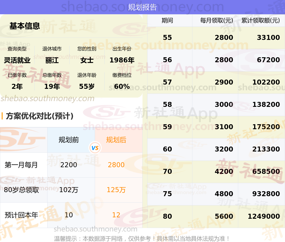 规划前:参保城市:云南丽江,性别:女士,出生年月:1986,已缴年限:2年,总缴年数:19年,退休年龄:55岁,缴费档位:60%。