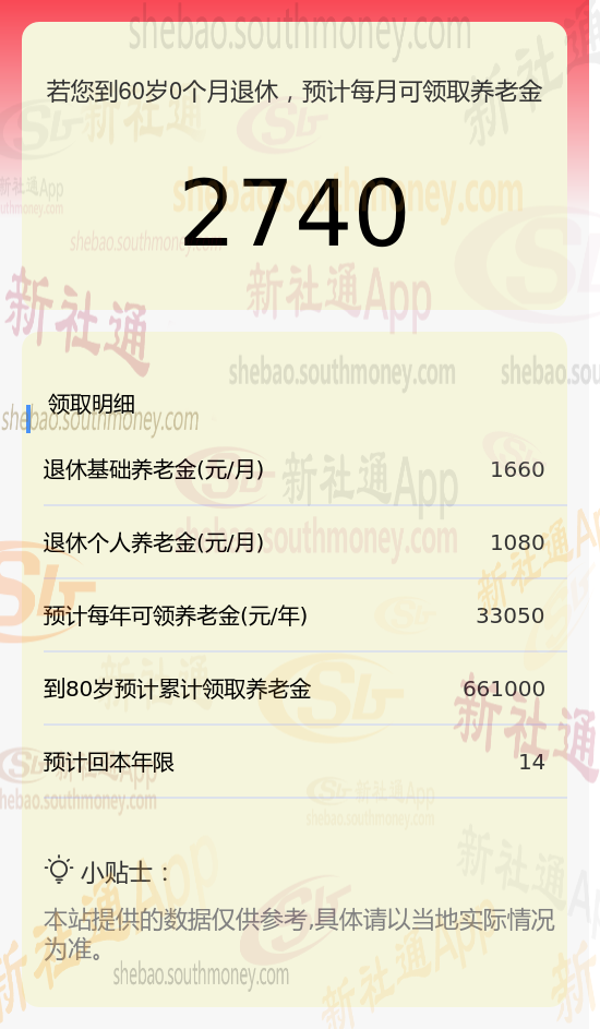 将基础养老金与个人养老金相加,我们得出每月可领取的养老金总额大约为2740元,即1660元(基础养老金)+ 1080元(个人养老金)。这个数字确定了退休后每月可以获得的稳定养老金收入。以上就是退休养老金的全部内容,如你对社保相关知识感兴趣,欢迎关注新社通APP解锁更多专业资讯!