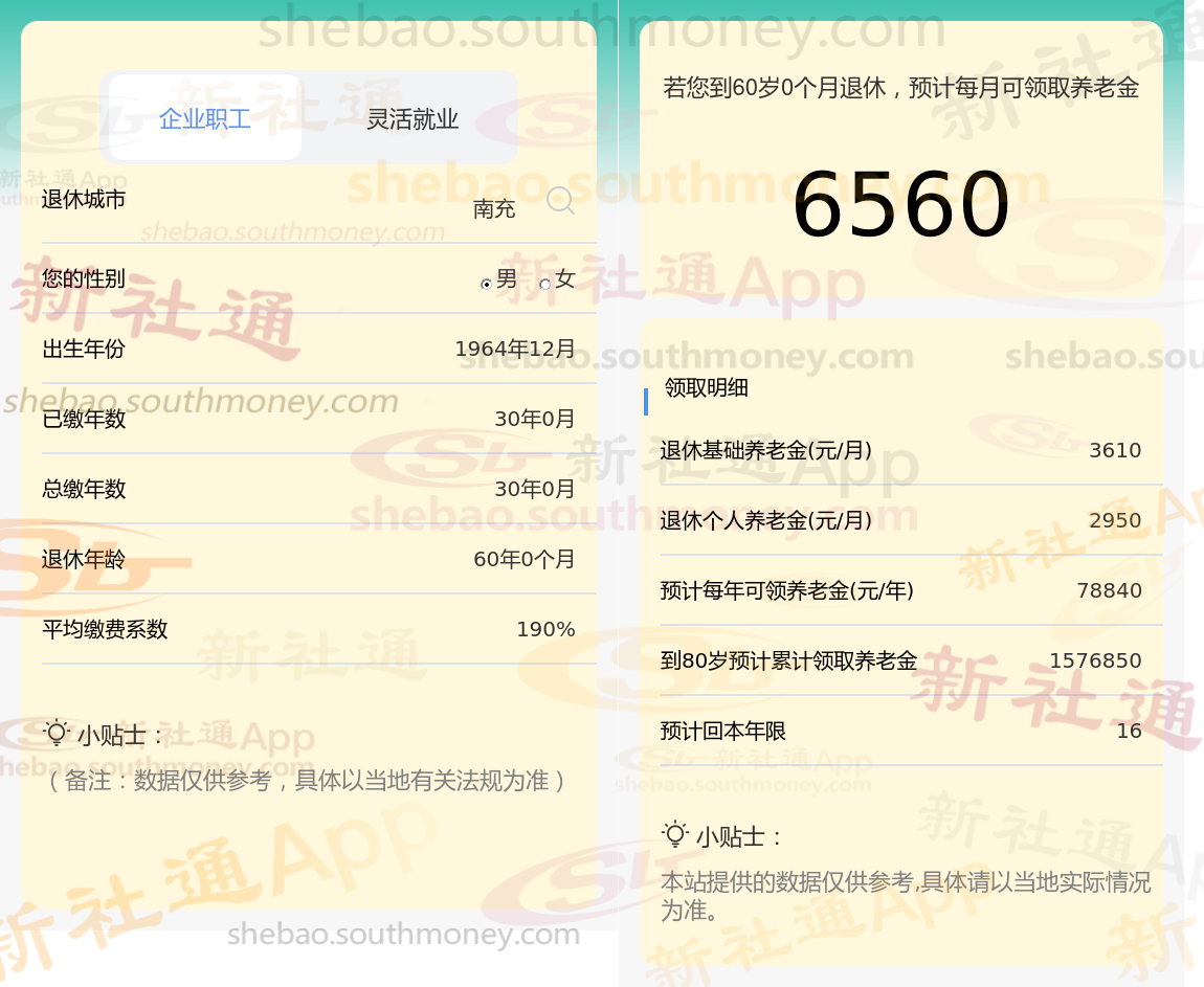 张某,作为一位有着30年缴费年限的退休者,其缴费档次一直保持在较高的190%水平。基于这些条件,我们使用了新社通app养老金计算器来为他做一个大致的估算: